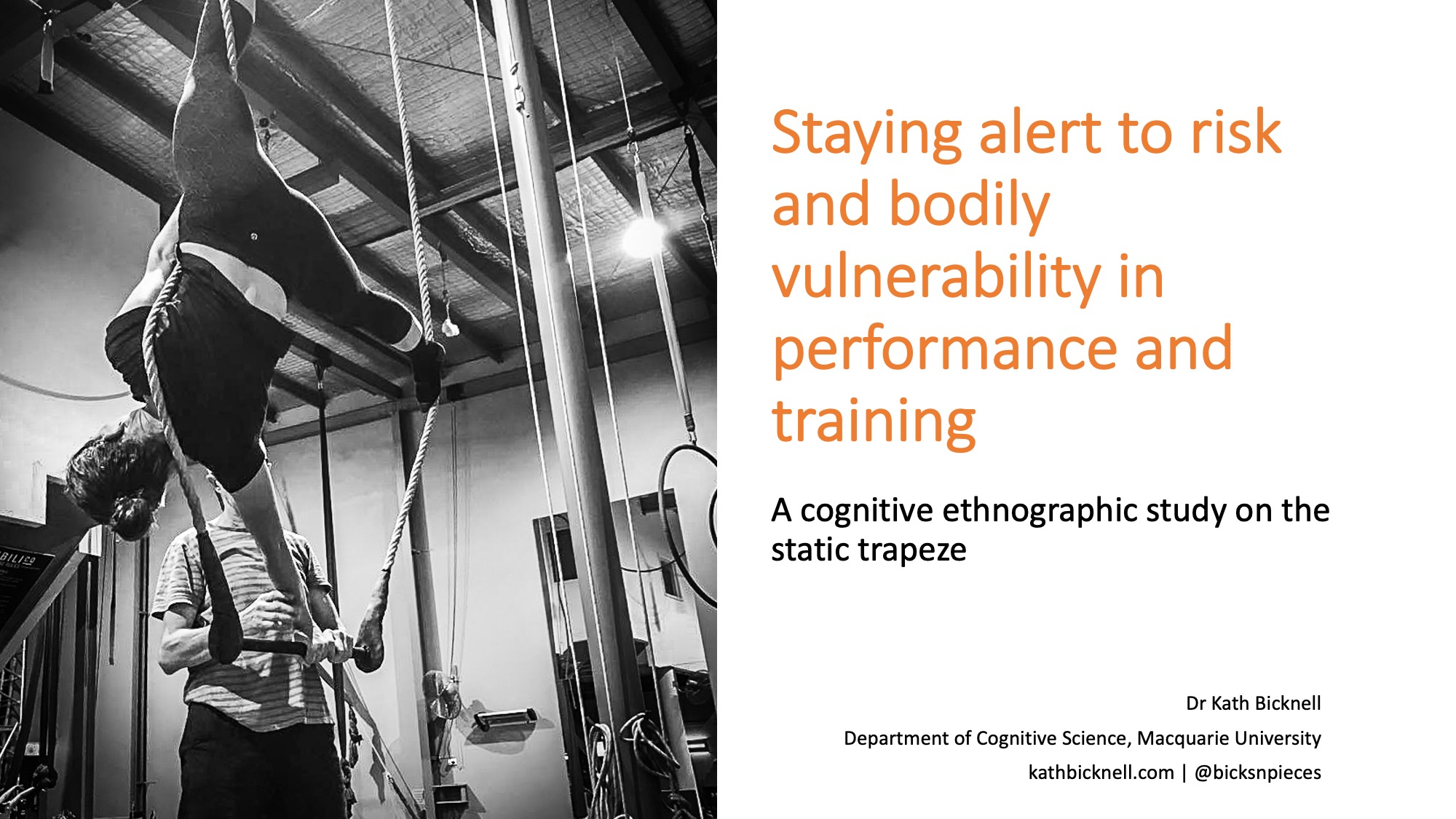 The main focus of the talk is on three cases studies from a really fun project learning the static trapeze, which I started in 2014. I question whether minds ‘go blank’ in performance and training and suggest roles for awareness and cognitive processes in such states that are far more useful and intriguing. Roles that keep us on task. And safe. A full abstract for the talk is below.